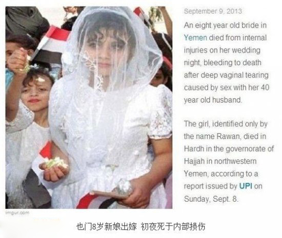 也门西北部哈杰省哈代市的一个家庭将他们8岁大的女儿Rawan,嫁给一个40多岁的男人,可怜的小女孩在这场包办婚姻的初夜,于内部损,科威特人呼吁对其家人采取严厉的惩罚。