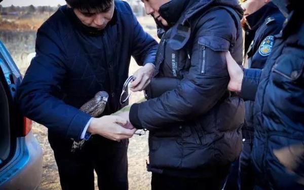 给售鸟者戴上手铐,被解救的红隼立在一旁,盯着手铐,鸣叫不已。