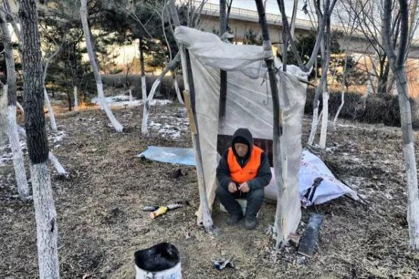 2015年11月,沈阳市,高楼林立的现代都市难有环卫工避寒之所,难敌刺骨寒风的他们纷纷在各自的卫生分担区内搭起简易的“避风港”御寒。