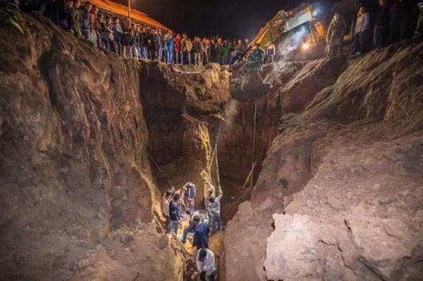 由于井口狭窄,只能一节一节的将水井管道拆下来,直到与被卡的距离缩短到一定程度,再用绳索套住赵红霞的手腕,把她从井中拉上来。随后,挖沟机在距离井口1米多远的挖掘,防止震动造成压力,将水泥管挤碎。待露出水泥管后,再用人工挖掘。