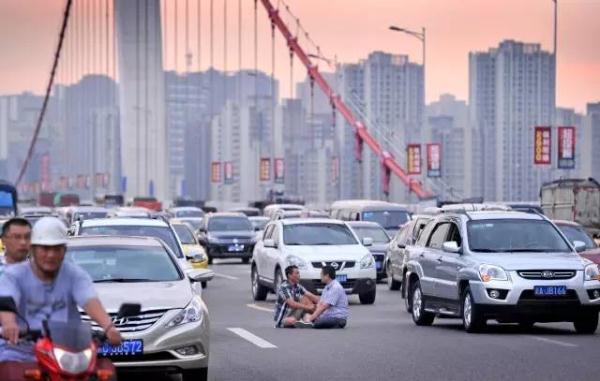 2015年7月23日,重庆鹅公岩大桥南桥头,一名出租车司机与男性乘客在来往的车流中当众发生争执,乘客认为司机忽快忽慢晃来晃去“开车太孬”而付车费。