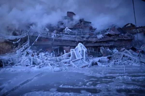 3日早晨,仓库起火现场,灭火所用的水结成了厚厚的冰,而这场灾难也让“冰城”新年蒙上了一层阴霾。