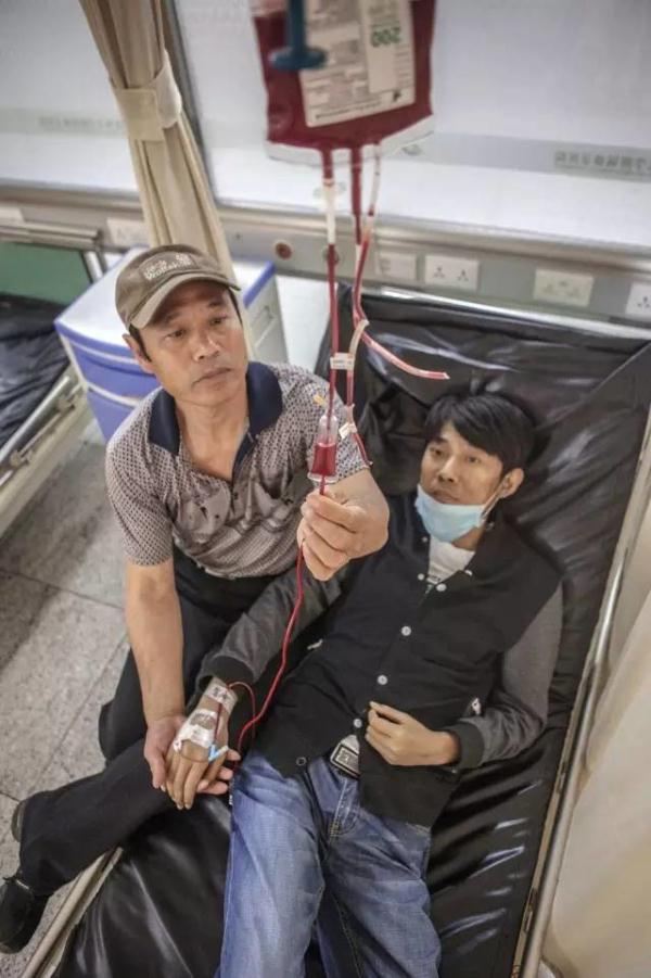 2015年6月19日,辽宁沈阳,王纯平陪着儿子王宇输血。3年来,每隔21天,王纯平都要献一次血小板,家中43本献血光荣证,每一本都记录着一次到三次不等的献血经历。献血,是他现在能救儿子的惟一途径。