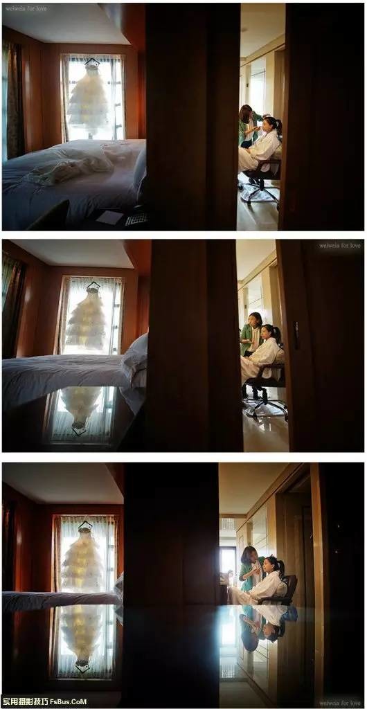从上到下的三张片子,显示了摄影师对的应用过程,更是摄影师拍摄思维以及创意发展的一个过程。我把婚纱挂在了窗前,用呼应的拍摄手法记录了第一张;接着发现了左下角有桌子,低角度利用倒影拍摄了第二张;接着想到如果把新娘也倒影进去或许会更好,所以我办了桌子拍了第三张。5MZ朵朵婚嫁网_结婚资讯门户|婚纱礼服|婚纱摄影|婚庆公司|蜜月旅行