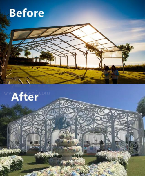 婚礼仪式现场“从无到有”的变化过程也是蛮让人惊讶的,为了打造这样的效果,专门用六架专机空运了50余万枝花材。