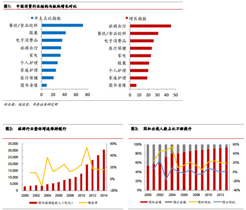 消费升级带来旅游从观光到休闲、从国内到国外的升级,尤其是出境游开始“常态化”。按照复星集团的数据测算,到2020年中国的中产阶级人数将会占到全球的16%左右,居于全世界第一,中产阶级的消费占比将达到16.7%。由于中产阶级人数的增加,中产阶级家庭比例的上升以及消费的增加,中产阶级占国内消费的比例将会从2012年的32%逐步增加到81%。所以与中产阶层相关的旅业未来在P中的重要性将大大增强,其中出境游领域更是将出现爆发式增长。我们一直强调:中产阶级消费升级一方面体现在消费的变化,愿意为“服务”买单促进社会服务业兴起;另一个表现在于带动了消费结构的变化,从旅游角度来讲,形态升级(观光到休闲)与地域升级(国内到国外)两大方面为整个行业带来了鲜活的动力。与中产阶级生活方式相关联的行业崛起,出境开始“常态化”。