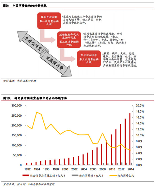 自1994年以来,猪肉在居民消费中所占据的比例从17.9%下降到了5.1%,年复合降速6.5%。而相对应的,P中旅游收入的占比却从1994年的2.1%上升为4.8%,年复合增速4.0%。中国人的消费偏好正逐步从猪肉(必需消费品)转向旅游,这两个风马牛不相及的消费品背后其实是马斯洛需求层次理论导向下,消费倾向从商品升级到服务的简单逻辑。经济学的著名理论“财富效应”指出财富的增长将会显著改变消费者的消费偏好。更针对性地阐述,当前中产阶级的兴起推动消费结构升级,服务型消费的比例正在不断扩大,旅业、乃至整个社会服务业正迎来巨大成长机遇;从更为宏观的层面看,消费结构升级将使消费成为我国下一阶段经济继续稳步增长的强大推动力。