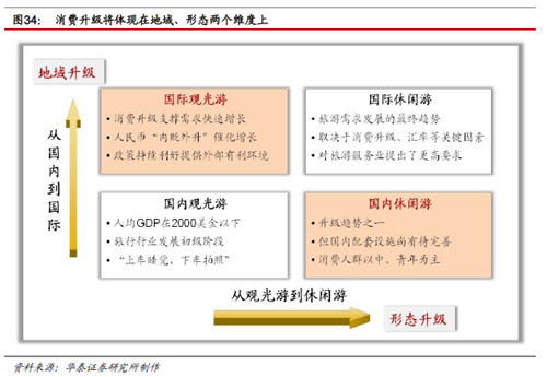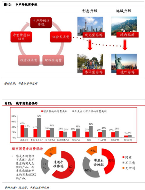 随着人均P的不断增长,逐渐由型消费转向发展型消费。当前中产阶级的兴起推动消费结构升级,服务型消费的比例正在不断扩大,旅业、乃至整个社会服务业正迎来巨大成长机遇;从更为宏观的层面看,消费结构升级将使消费成为我国下一阶段经济继续稳步增长的强大推动力。