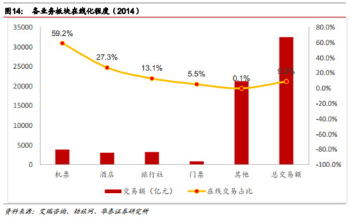 按目前主流的划分,旅游业交易额可按机票、酒店、打包游和其他等分为四部分。我们使用劲旅网的基础统计数据:2014年,机票总交易额3912.3亿元,在线率交易额占比(后面简称“在线率”59.2%;酒店总交易额3090.8亿元,在线率27.3%;度假旅游总交易额3285.1亿元,在线率13.1%;景区门票总交易额899.0亿元,在线率5.5%;其他部分总交易额21312.8亿元,在线率0.1%。那么我们可以得到: