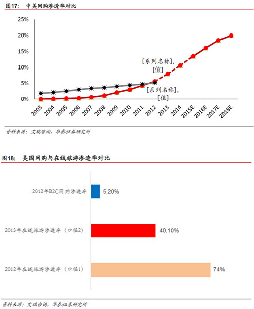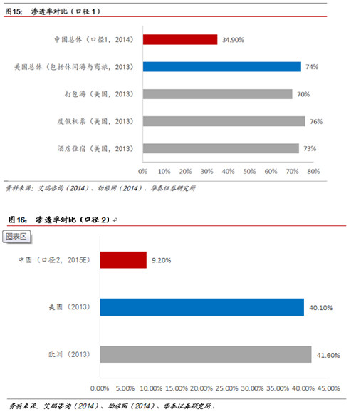 参考美国市场,对应口径1,根据eMarketer的数据,若仅考虑酒店住宿、机票、打包游,则2012年美国在线旅游渗透率为74%;对应口径2,根据德意志银行的数据,若综合考虑整个行业,2013年美国在线旅游渗透率是40.1%。中国互联网渗透程度已居世界前列,但目前中国在线旅游渗透率仍有很大的提升空间。