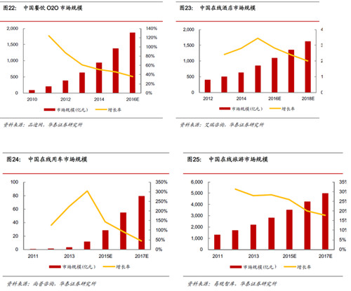 从生活服务的市场规模来看,吃、住、行、游四大板块均呈现稳定增长势头。除了在线用车仍属于新兴市场,其他市场已达千亿级规模,生活服务O2O未来的发展空间十分巨大。