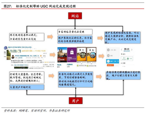 旅游大数据方面,UGC模式有望重构旅游产业链,大数据时代的到来使得UGC的价值不简单局限在“分享”中。通过对用户信息的特定筛选和分析,UGC网站得以清楚地知悉游客在不同目的地预设的时间、消费偏好等大量信息,利用大数据分析发现需求的最新变化,以及现有供需不匹配的环节,通过标准化定制在自身的渠道进行产品销售,从而实现数据变现。