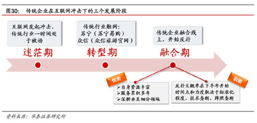 Offline to online:在互联网的冲击下,传统企业将依次经历迷茫期、转型期和融合期。部分优势公司已进入到后两个阶段,但市场仍因其传统企业的标签而大幅低估其价值,存在一定预期差,因而具有较大的投资价值。