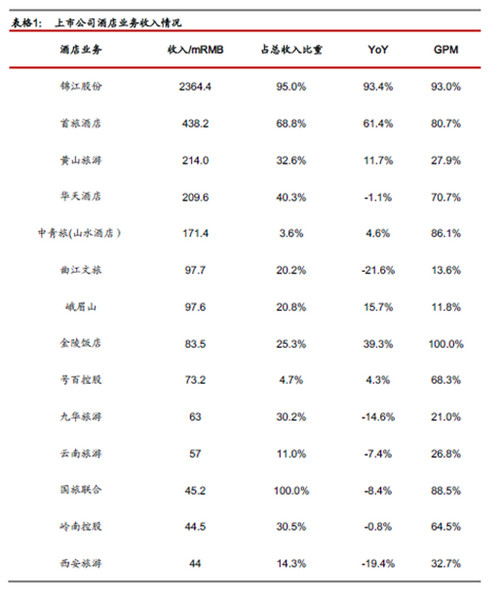 (1)景区方面:根据最新拆分数据,A股涉及景区业务的公司有17家,总体收入规模上,中青旅(图中数据代表中青旅整体收入情况)、黄山、宋城排名居前,中青旅乌镇及古北合计贡献收入近7亿元,在景区运营板块收入规模排名第一。成长性上,仅考虑景区业务,宋城、张家界、、北部湾、中青旅(景区运营业务)增速靠前,除张家界受索道产能扩张的影响,上述景区运营公司的成长性主要来自游客的内生增长。