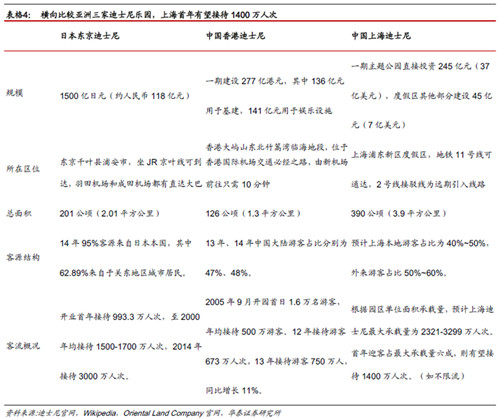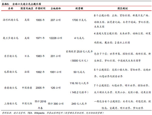 上海迪斯尼有望带动上海及周边地区旅游产业链要素发展。如上文所述我国主题公园普遍产业链较短,参考国际成熟经验,目前主题公园发展的主要趋势是与零售业、传媒、娱乐等行业相融合,延长产业链,拓展盈利空间,而上海迪斯尼有望促进国内相关产业要素升级,同时将直接带动上海及周边地区旅游要素发展。上海迪士尼乐园度假区(Shanghai Disney Resort)位于浦东新区川沙新镇,是中国第一个、亚洲第三个、也是全球第六个迪士尼主题公园,预计2016年春节后开园,上海迪士尼占地面积为390公顷,根据园区单位面积承载量估算,预计上海迪士尼最大承载量为2321至3299万人次。预估首年客流1400万人次。根据东京、迪士尼客流量发展经验,首年接待游客人次占稳定后客流比例为58.41%至66.67%区间,按60%估计上海迪士尼首年接待游客数在1400万左右。