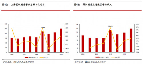 迪士尼带来的大量外省来沪客流有望驱动上海地区酒店的入住率和平均房价同步增长。参照世博会期间,上海地区星级酒店客房出租率从年初的60%左右增长至75%-80%,提高了15-20pp左右;而平均房价从550元左右上涨为700元左右,上涨约27%,相应的酒店Revpar同比增长了59%-70%。同年,上海市星级酒店营业总额从前一年的158.10亿上升至220.40亿,同比大幅增长39.4%。