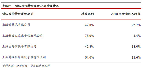 具体到公司层面,上市公司中锦江股份投资了4家餐饮公司,分别为上海肯德基、新亚大家乐、吉野家、锦江同乐餐饮管理公司。其中,上海肯德基于2010年度实现营业收入 266874 万元,比上年同期增长27.69%,上海锦江同乐餐饮管理有限公司于2010年度实现营业收入 2377万元,比上年同期增长29.63%。
