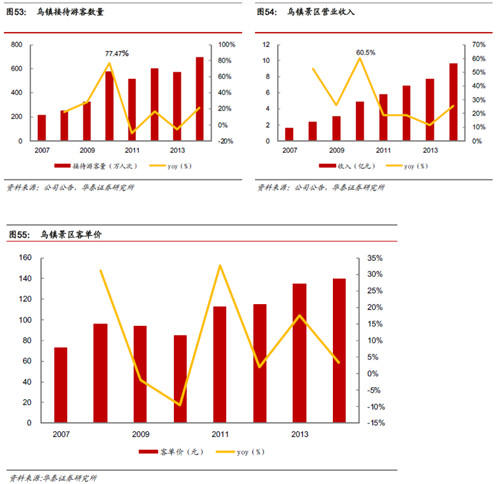 乌镇位于浙江,距离上海只有100多公里,自驾需仅2个小时,动车有很多班次,交通便利。受2010世博会的客流溢出效应,当年乌镇接待游客数量激增77.47%,增加251万人次。景区收入方面,2010年乌镇收入比去年增加60.5%,之后几年仍保持持续增长。客单价方面,长期来看呈现持续上升态势,从2007-2010的80多元客单价上涨为近4年的120-140元区间,上年涨幅度大于50%。
