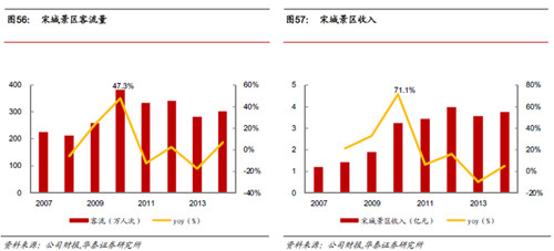 宋城景区位于杭州,曾被评为中国人气最旺的主题公园。杭州距离上海很近,因此受上海迪士尼的辐射效应很明显。并且宋城距离西湖仅有14公里,驾车半小时左右,两大景区形成很好的协同效应。2010年受世博会的影响,杭州宋城景区客流量增加47.3%,增量约为122万人次,营业收入增加71.1%,远超过其客流量的增长幅度,表明宋城景区的客单价水涨船高,景区所提供的餐饮旅游综合服务的需求上升。并且在之后几年内客单价保持稳定增长,从2010年的84元上涨为2014年的124元,上涨幅度为47.6%。