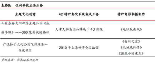 恒润科技三大主营业务分别为主题文化创意、特种电影拍摄制作、4D特种影院系统集成,凭借积累多年的主题数字娱乐设计能力、特种影视设备研发技术及特种影视内容资源,满足了主题公园、体验馆、大型企事业及商业用户的定制化需求,形成了山东泰安太阳部落主题公园《地心历险》、广饶孙子文化公园飞翔球幕一体化项目等经典项目。
