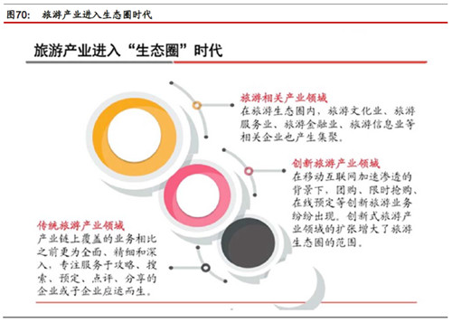 3)产品、服务升级:消费升级倒给端,产品服务消费者需求将通过互联网平台迅速传到至供给端,有能力尽早实现产品服务升级的企业将更加充分的享受旅游服务需求崛起所带来的行业红利,旅游生态圈、旅游综合服务平台是未来重要的发展方向。同时行业目前仍存在集中度低、资源配置效率不高的现象,应关注并购整合所带来的产业链效率提升。代表公司:凯撒旅游、腾邦国际、锦江股份。