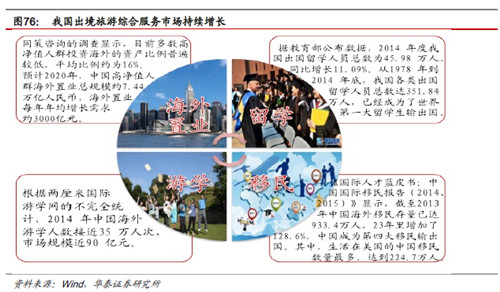 出境游的本质是享受国外优质要素供给,观光度假休闲只是一种体验形式。由于中国面临高等教育水平相对发达国家落后、雾霾等污染问题的困扰,中国人对于出境置业、移民、留学等其他出境服务的需求十分强烈,中国出境人次目前已加速上升的态势发展,其中包罗了多种细分需求,诸如教育、医疗、移民、海外置业等,而目前此类供给尚不充分,立足于出境旅游的综合出境服务市场都将拥有更为广阔的成长空间。