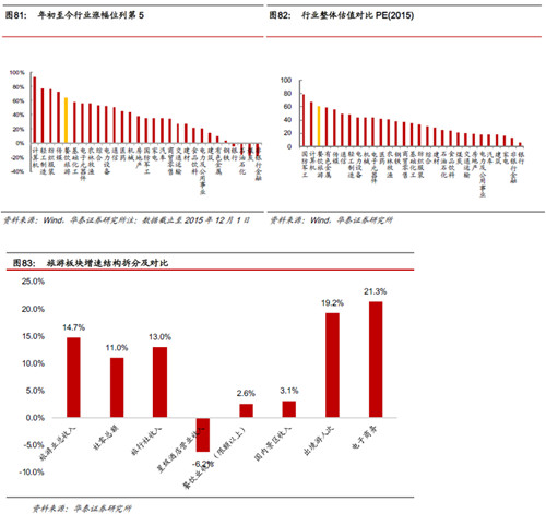 2015年初至今旅游板块涨幅71.4%,在中信指数全部行业板块中排名第5;旅游板块加权平均PE(2105)为58.3,为全市场第三;旅游板块内各系分行业成长性分化巨大,出境游等高增长行业拉动旅业加速增长。板块高估值、高弹性、高分化的特点显著。