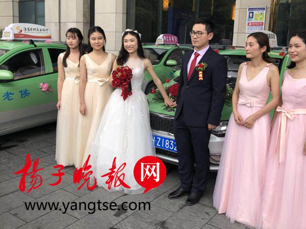 正在江苏科技大学读研的新郎蒋达告诉记者,新娘曹建成与他是大学同学,大学毕业后,小曹到上海工作,而他则继续留在母校读研,在相恋三年后,他们于6日正式步入婚姻。怎么想起来用出租车做婚车队伍的?面对记者的疑惑,蒋达告诉记者,那是因为他的父母都是淮安老候出租车公司的司机,父母的同事得知他要结婚的消息后,纷纷表示要前来帮忙,于是与小曹商量后,他们冒出一个想法——请父母同事开出租车迎亲。蒋达说,这个想法他的父母很是赞成,但是女方小曹的父母会赞成吗?当他小心翼翼地将想法告诉未来岳父母时,没想到,两位老人家很是通情达理,举双手赞成。