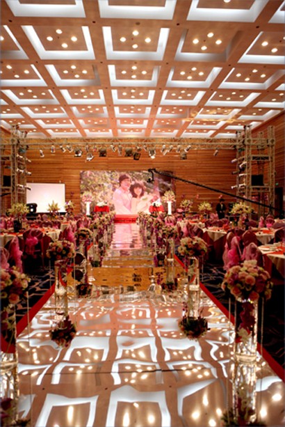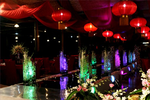 9.纱缦背景前鲜花装饰(4个鲜花柱、带灯)