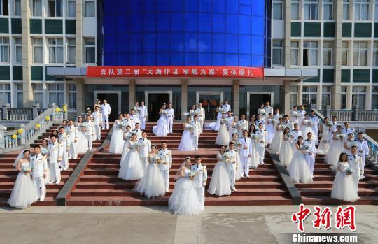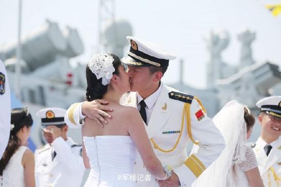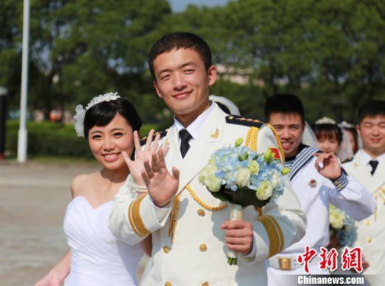 舟山35对新人集体举行军港婚礼9月24日,农历八月廿四,一个良辰吉日,浙江舟山某军港处处洋溢着喜庆,东海舰队某舰支队在这里为35对新人举行集体婚礼。这是该支队举办的第二届“大海军舰为媒”主题集体婚礼。